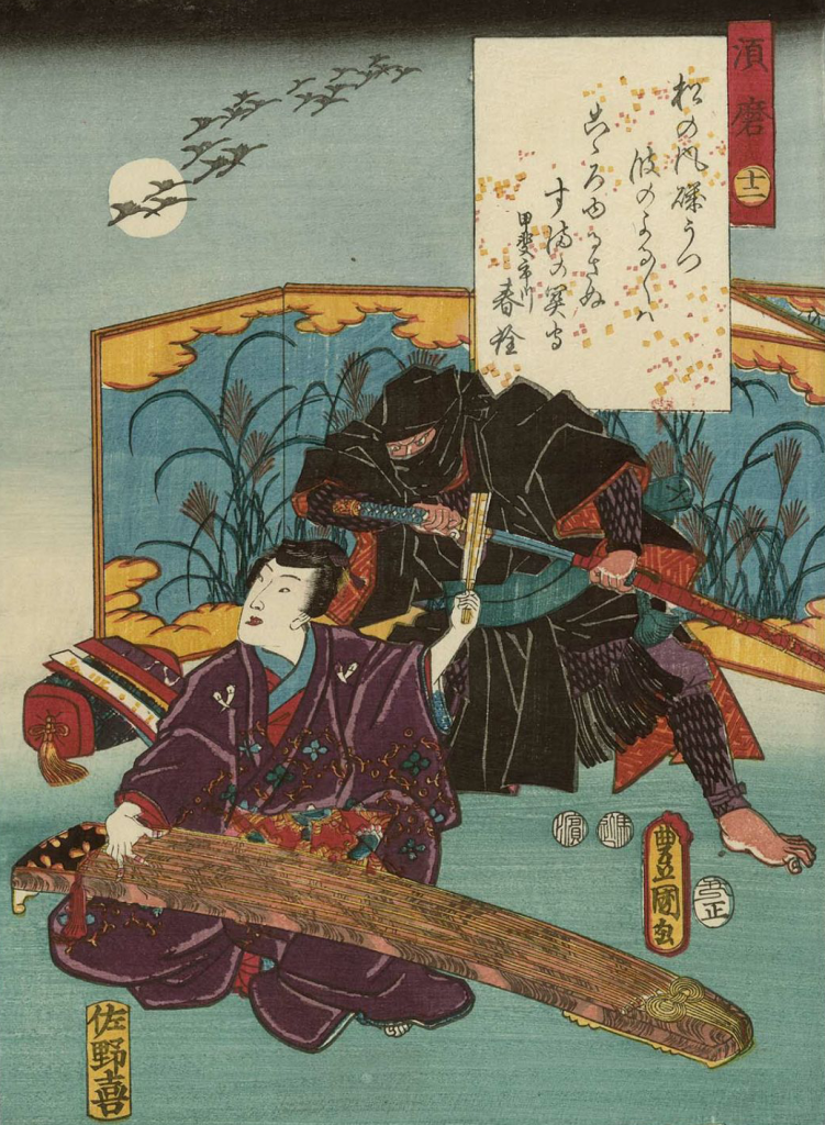 An ukiyo-e woodblock print from 1852 by Utagawa Kunisada depicting a shinobi no mono preparing to assassinate Prince Genji.